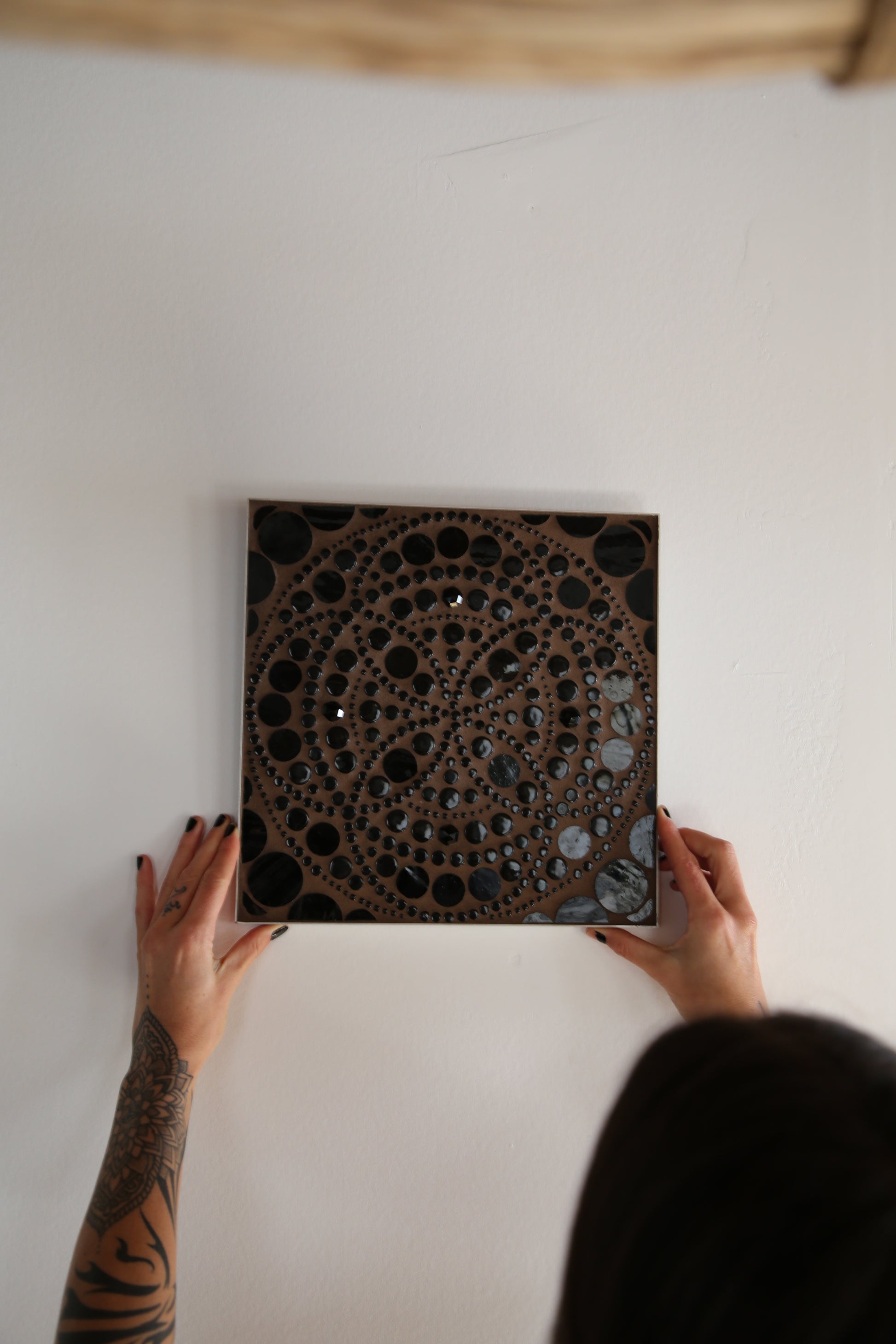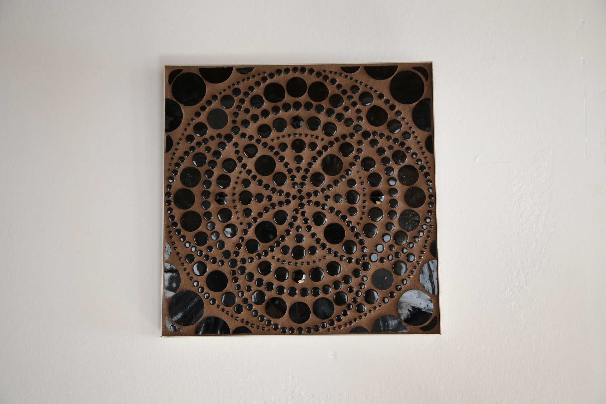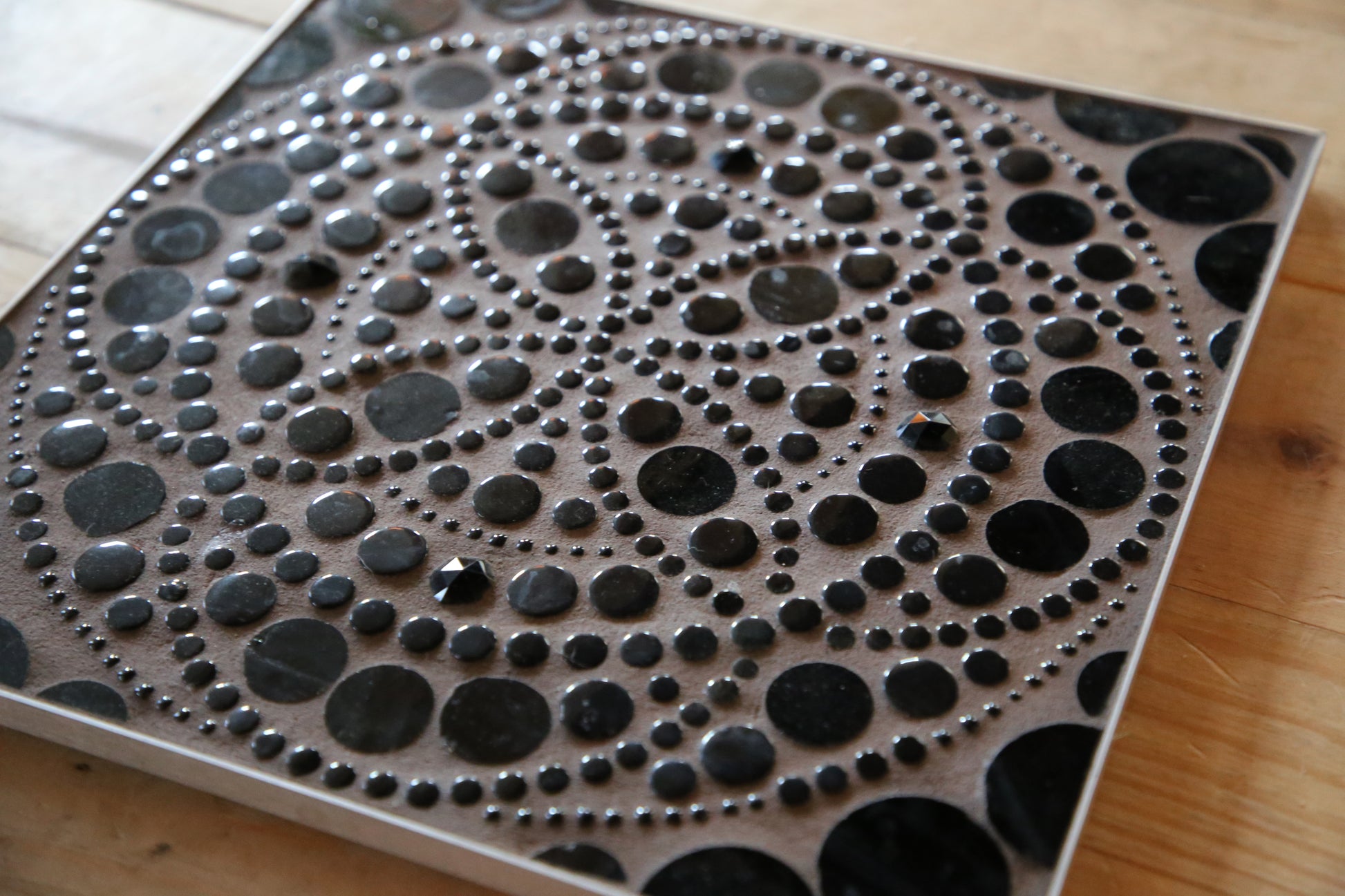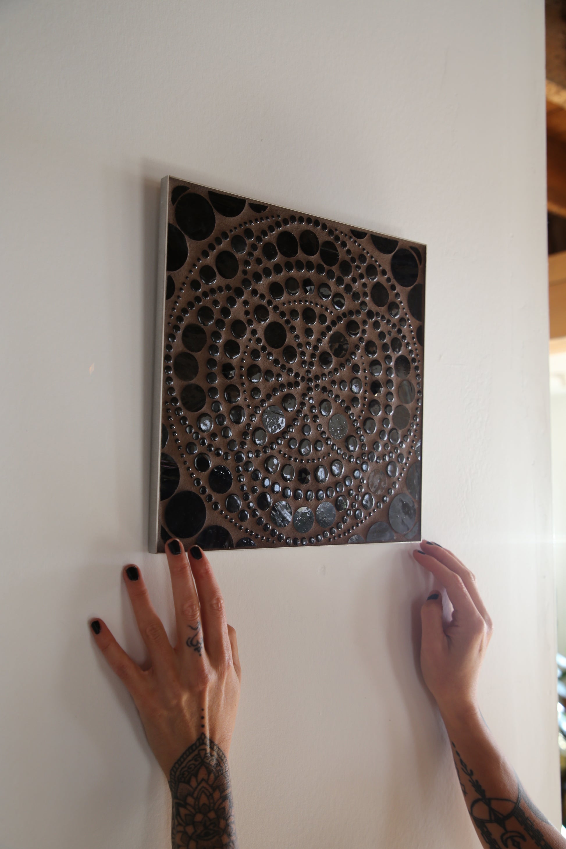 materials: glass tile, concrete board substrate, aluminum frame, grout.